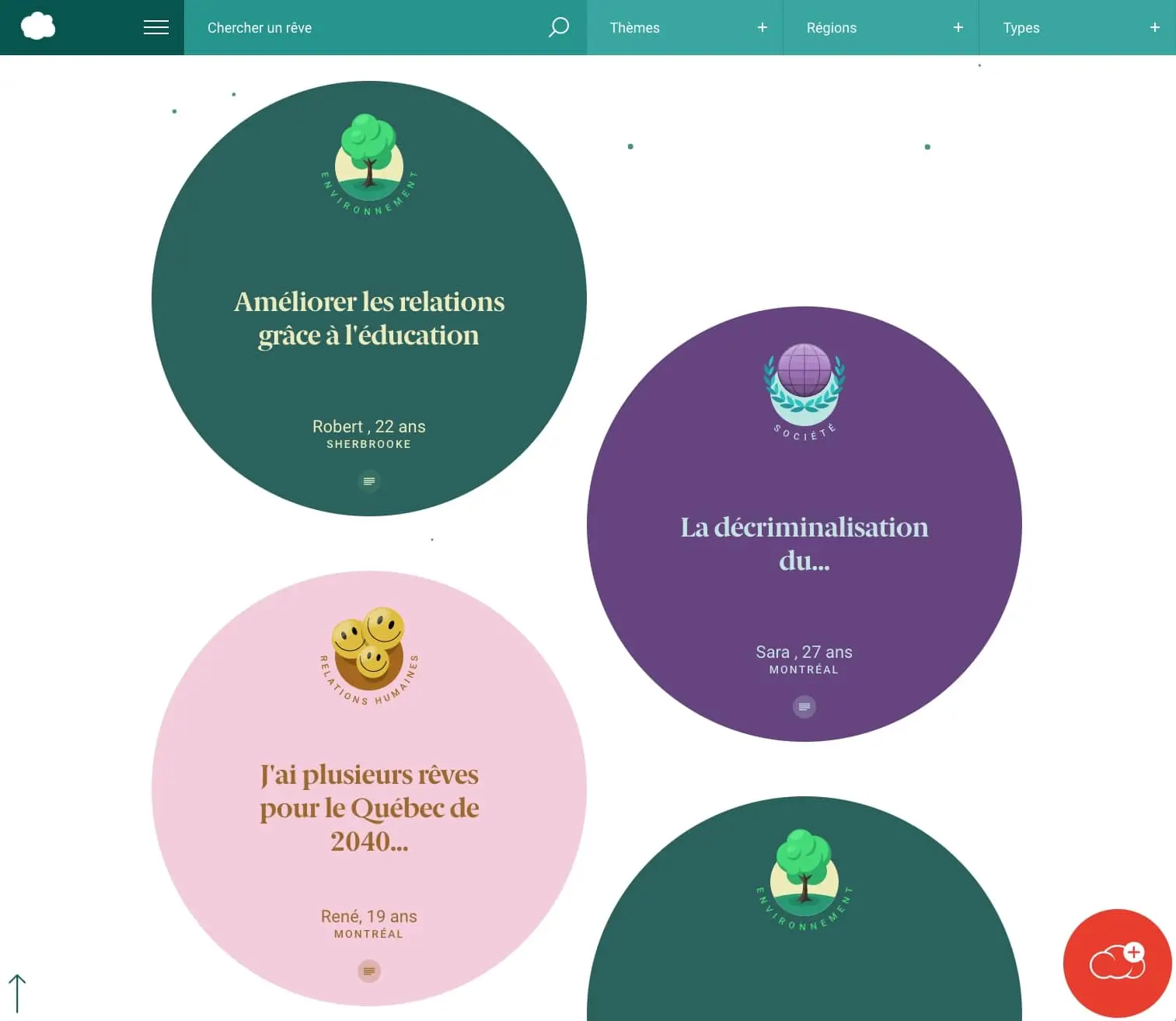 Des animations simples ont été intégrées à travers le site pour représenter un univers onirique tout en restant intuitives et accessibles. Une iconographie ainsi qu’une palette de couleurs ont également été créées pour identifier six grandes catégories de rêves.